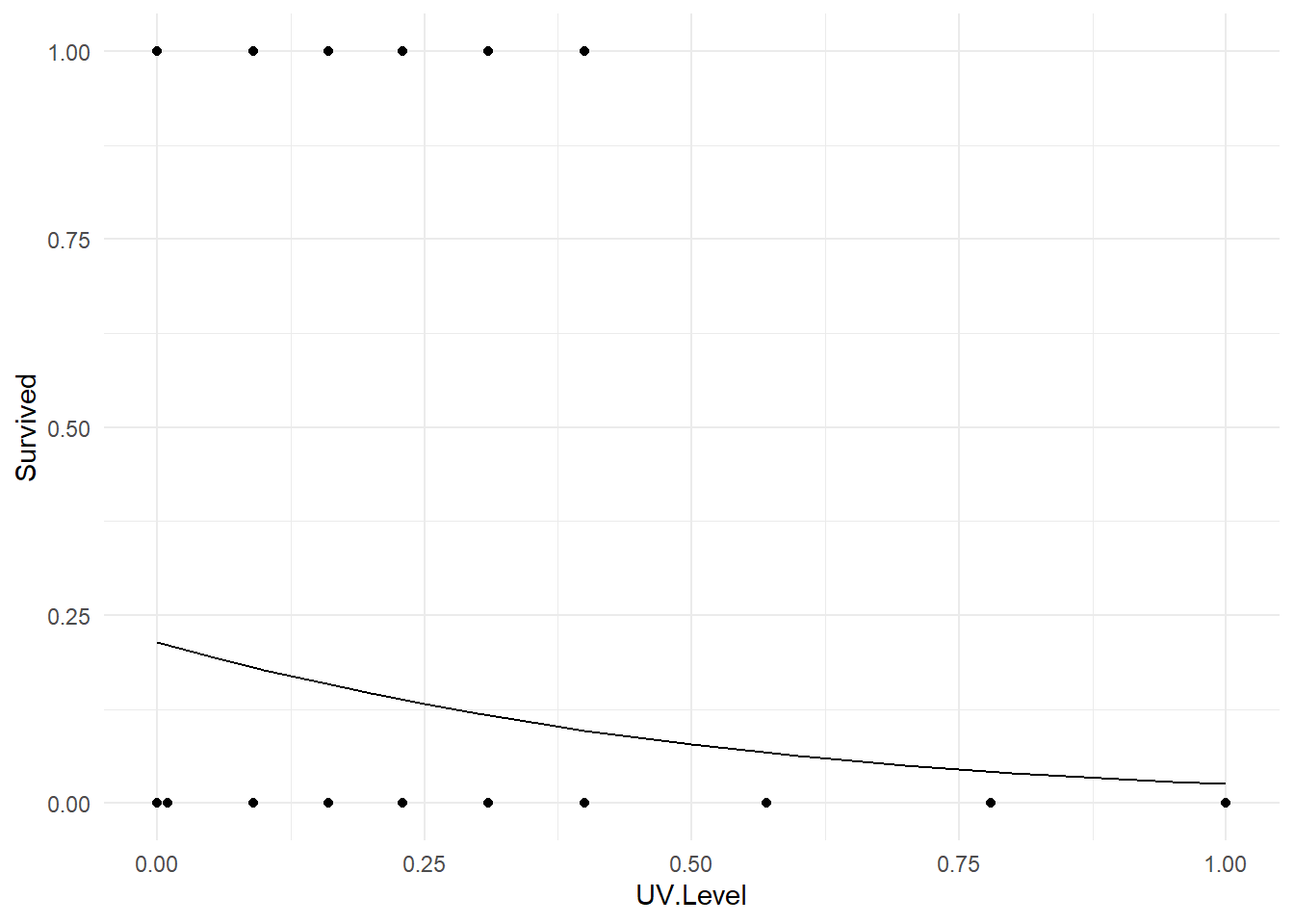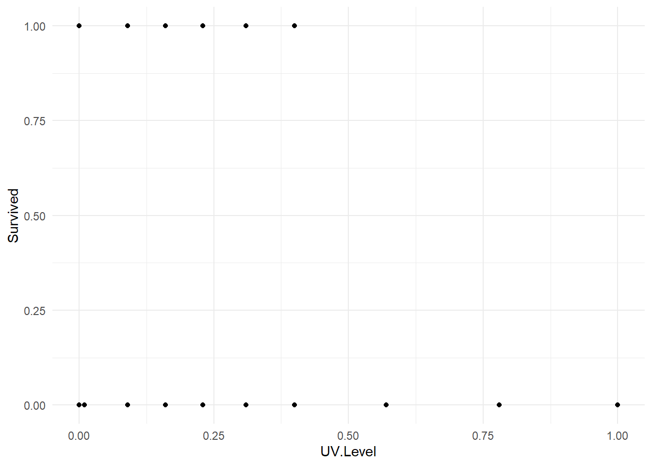 geom_point(aes(x=UV.Level, y=Survived) ) +
